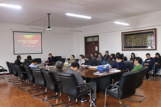 为深化学习宣传贯彻党的十九大精神和省委十二届二次全会精神,引领广大师生把思想和行动统一到党的十九大和省委十二届二次全会的决策部署上来,B体育于2018年4月11日14:00在汇文楼834会议室举行学习党的十九大精神专题讲座。本次讲座以“决胜全面建成小康社会的冲锋号——党的十九大精神宣讲”为主题,由黑龙江大学哲学院康渝生教授主讲。学院领导、全体教师和学生党员代表参加了学习。