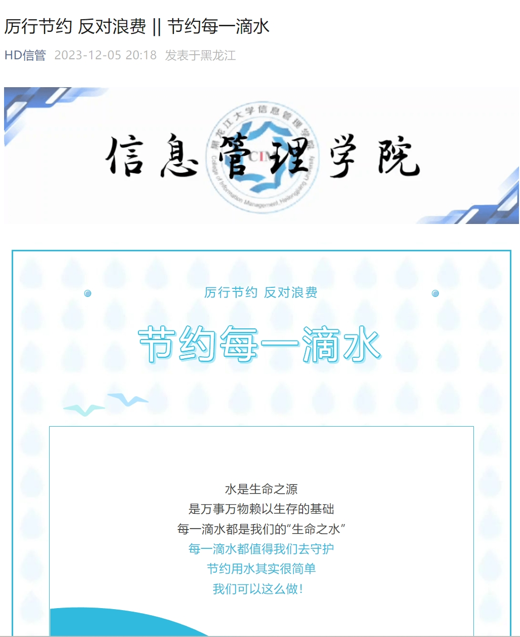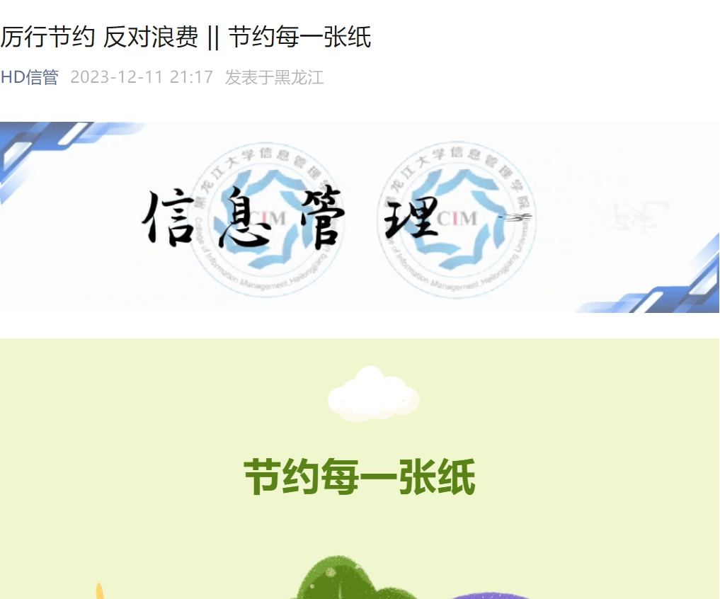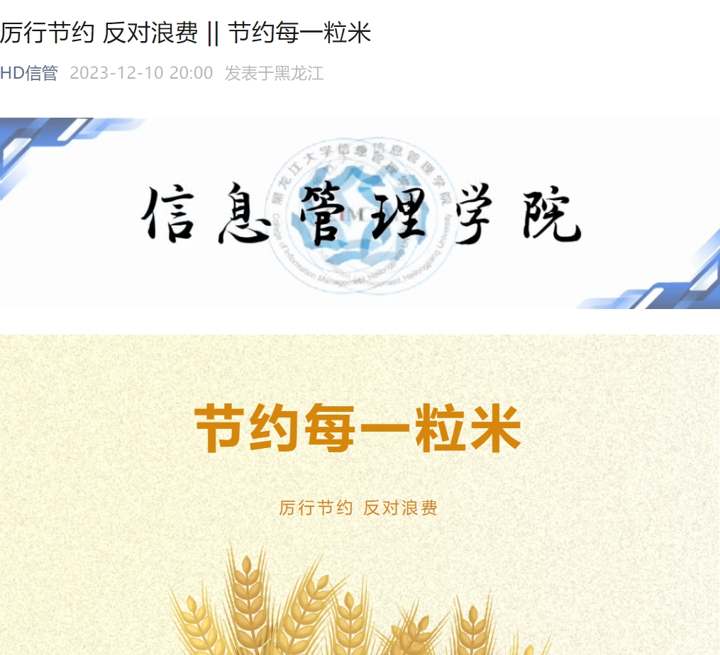 B体育高度重视学生工作部指示,于2023年12月5日至12月12日发表了主题为“节约每一滴水”、“节约每一度电”、“节约每一张纸”、“节约每一粒米”、“节约每一分钱”的节俭行动倡议书。通过学院的积极号召,信管学子切实意识到了节俭的重要性且领悟了厉行节约的具体做法。本系列节俭行动倡议书充分调动全院学生加入到厉行节约的队伍之中,助力信管学子更好地培养节约意识。