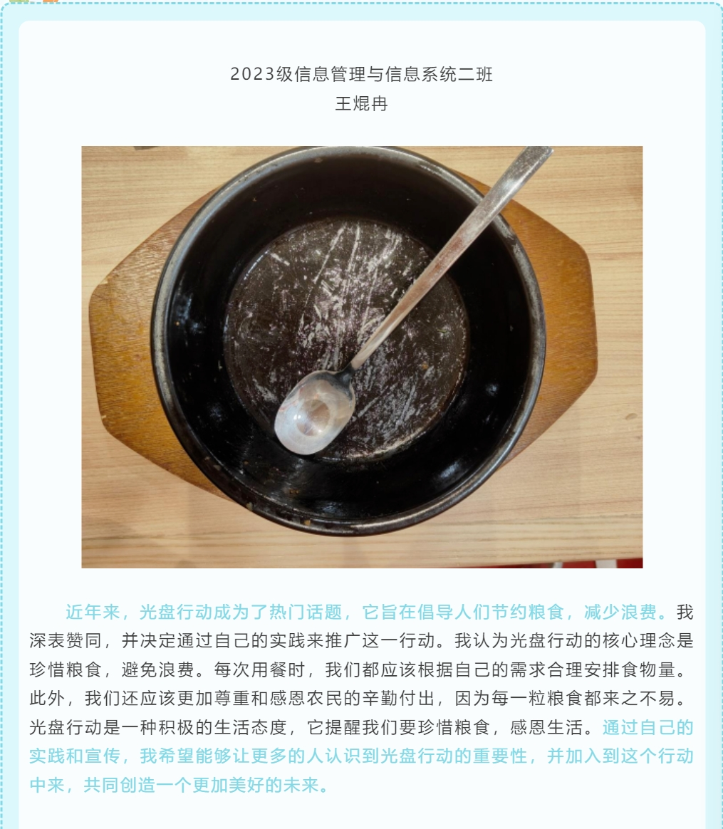 桑田碧海须臾改,节俭之风不可移。为响应习近平总书记对“厉行节约,反对浪费”的号召,进一步增强同学们珍惜粮食的意识,养成良好的饮食习惯,摒弃浪费之风,树立健康理念,携手共建“节约型”校园,B体育于11月26日至12月4日开展“不负‘食’光,你我同行”光盘打卡活动。本次“不负‘食'光,你我同行”光盘打卡活动在信管学子的参与下,取得了非凡效果,帮助同学们在接下来的生活中杜绝“舌尖上的浪费”,牢记“谁知盘中餐,粒粒皆辛苦”的不易,从生活习惯开始,从节约粮食做起,真真正正地让节俭美德内化于心、外化于行。