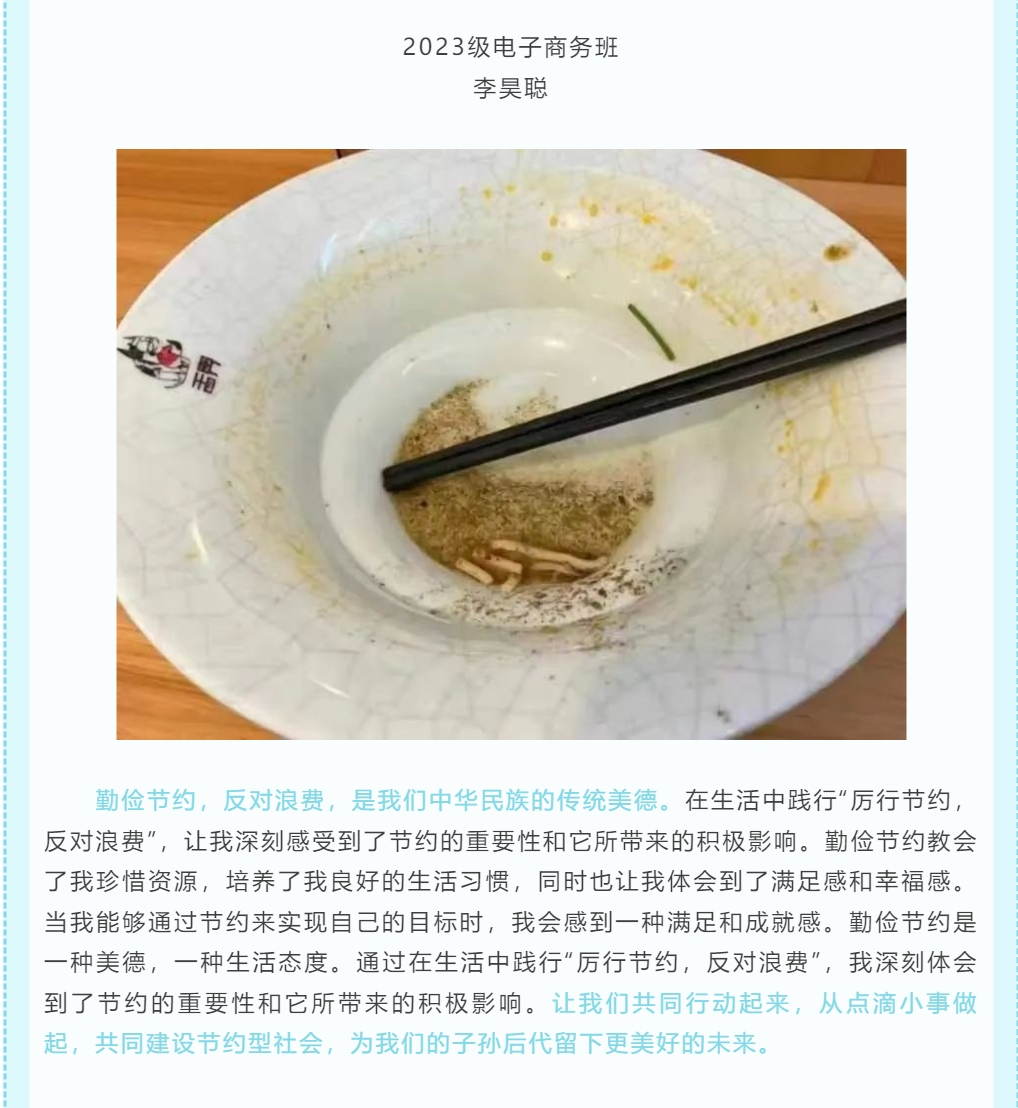 “厉行节约、反对浪费”不仅是一句简单的号召,更是我们需要长期躬身实践的行为。作为新时代青年学生应做勤俭节约的传播者、践行者、推广者,做到“君子以俭德辟难,不可荣以禄”。未来,信管学子将以更加饱满的热情积极投身到勤俭节约的行列之中,用行动书写新时代青年勤俭节约的壮丽答卷,让绿色之风盛行在生活的每一处角落!(B体育供稿)