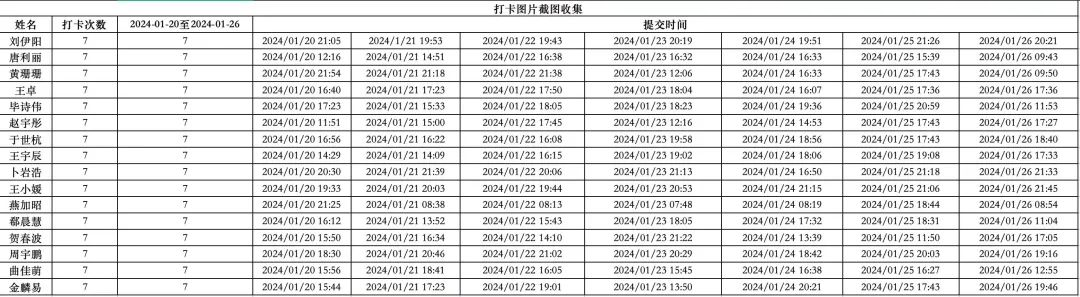 打卡一周健身运动活动完成名单如上表,可凭此加德育学分。