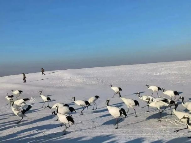 晴空一鹤排云上,便引诗情到碧霄。奔赴于此,品丹顶鹤“低头乍恐丹砂落,晒翅常疑白雪消”的秀逸典雅,冰清玉洁;奔赴于此,觅一处芦苇与沼泽星罗棋布,游人与鹤近在咫尺的仙境;奔赴于此,观仙鹤盘旋于空际与雪地上下一白,天空湛蓝抚平心中涟漪;奔赴于此,群鹤起舞体会生态之美,松鹤延年寄托美好祝愿。