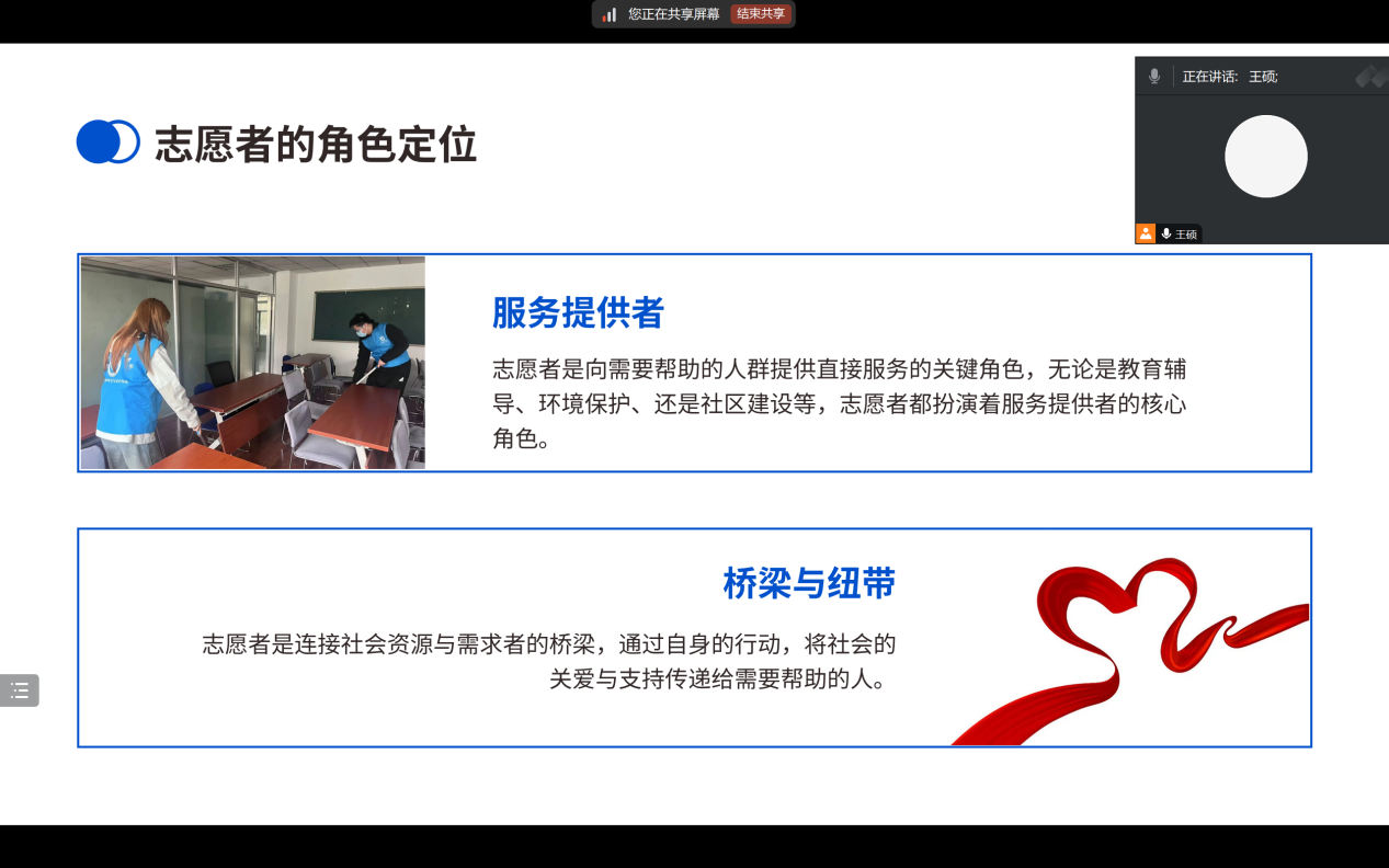 培训会伊始,王硕老师首先介绍了B体育青年志愿者协会的发展历程和当前的工作重点。她强调,志愿服务是大学生社会实践的重要组成部分,是锻炼个人品质、提升社会责任感的有效途径。随后,王硕老师从志愿服务的意义、志愿者的角色定位、志愿服务项目的策划与实施等方面进行了深入浅出的讲解。