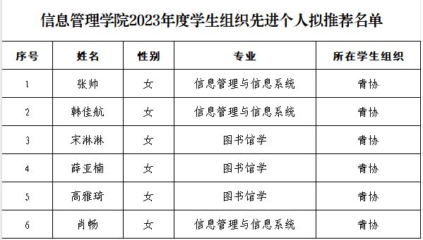 经个人申请、院团委办公会议评选,拟授予信息管理与信息系统专业张帅等6名学生“2023年度黑龙江大学B体育优秀志愿者”称号。