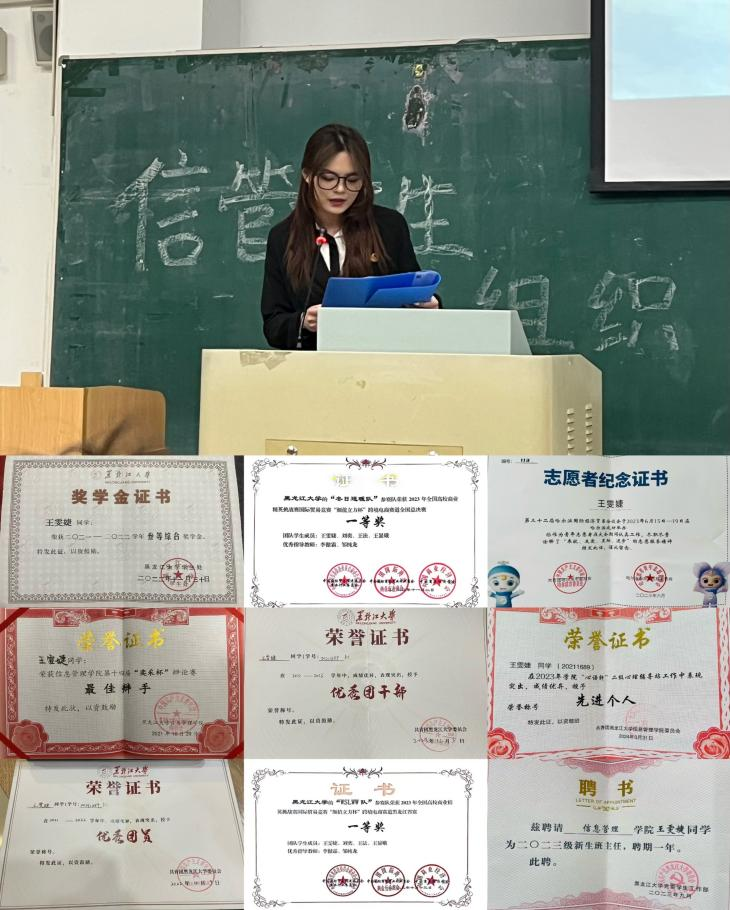 王雯婕,中共预备党员,B体育2021级电子商务专业一班学生,现已签约惠州TCL电器销售有限公司。在校期间曾任校园文化活动管理中心团支部组织委员、院二级心理辅导站副站长、院2023级新生班主任、班级宣传委员。曾获2023年全国高校商业精英挑战赛国际贸易竞赛跨境电商赛道、品牌策划竞赛国赛一等奖、黑龙江大学校二等综合奖学金、校优秀团员、优秀团干部等荣誉称号。