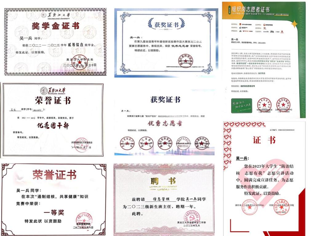 吴一兵,女,中共预备党员,黑龙江大学B体育2021级图书馆学专业学生。现任班级团支书、2023级图书馆学班新生班主任,曾任校青年志愿者协会主席、B体育青年志愿者协会副主席。在校期间获得校二等综合奖学金、校“优秀志愿者”、校“优秀团干部”、黑龙江大学第二十八届校园最佳道德风尚奖、校社会实践“先进个人”等荣誉称号10余项。现为我校第27届研究生支教团成员,成功推免至黑龙江大学图书馆学专业。