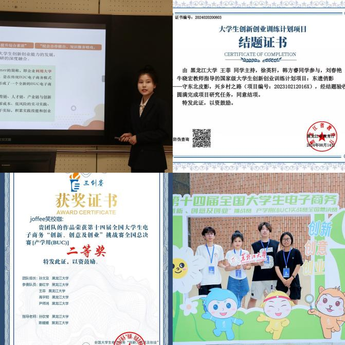 无畏征途,勇往直前。她在专注专业学习的同时,同样注重竞赛对自身的提升。她在大二、大三学年主持国家级大创项目,曾获三创赛国家级二等奖的好成绩。期间,她不断地与老师沟通,带领队员反复研究项目选题、经营模式、品牌理念等;从地推的筹备物料、设计环节到执行,她力求细致。即使在假期,她仍然保持积极的态度,持续输出项目、IP相关短视频和公众号内容。一张张被修改的稿子、看了上百遍的PPT、练到脱口而出的演讲……都是她努力奋斗的印记。她认为,参加竞赛不仅能够帮助实现理论结合实际,还能多出去、多学习、多参与、多交流,面对来自全国各所高校的精英,创新创意被集聚、学习机会被汇聚,这对能力提升、开拓眼界是具有重要意义的。