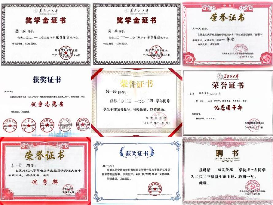 不忘初心、筑牢学习教育。大学期间吴一兵始终以学习为第一要务,综合排名班级第4。33门功课成绩在90以上,并积极考取其他技能证书,获得高中语文教师资格证,普通话二甲证书等。身为班级团支书,积极组织同学开展主题团课学习30余次,班级青年大学习参与率始终保持100%。在校期间积极服务于黑龙江省党课大赛、校学生代表大会等多项大会。作为青年代表热议十四届全国人大二次会议、校第八次团代会等,以实际行动发挥党员先锋模范作用。