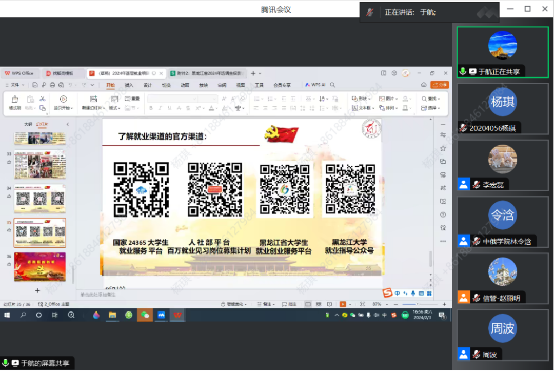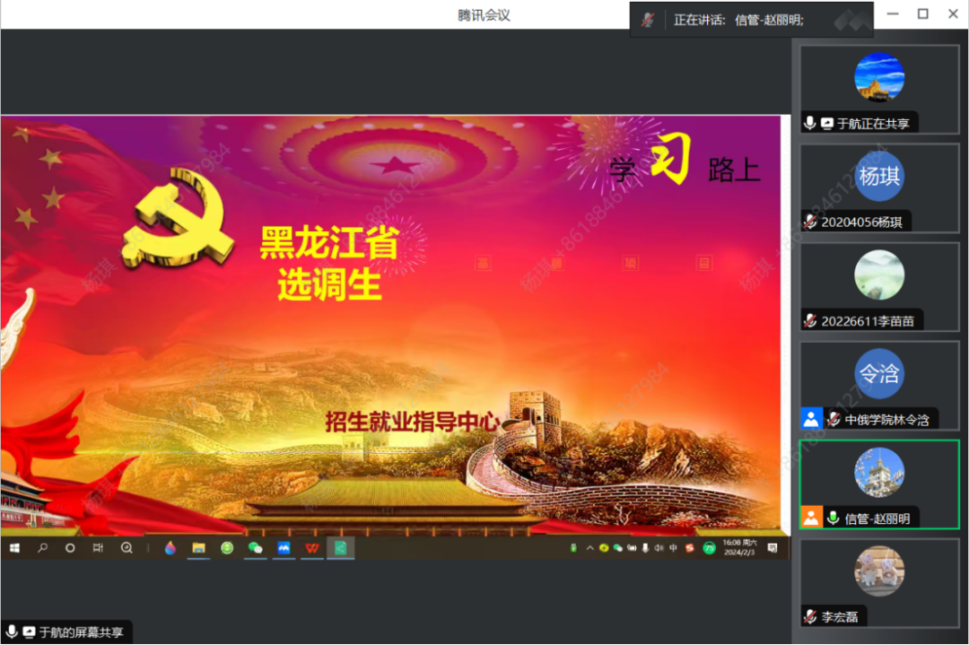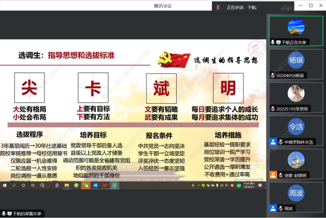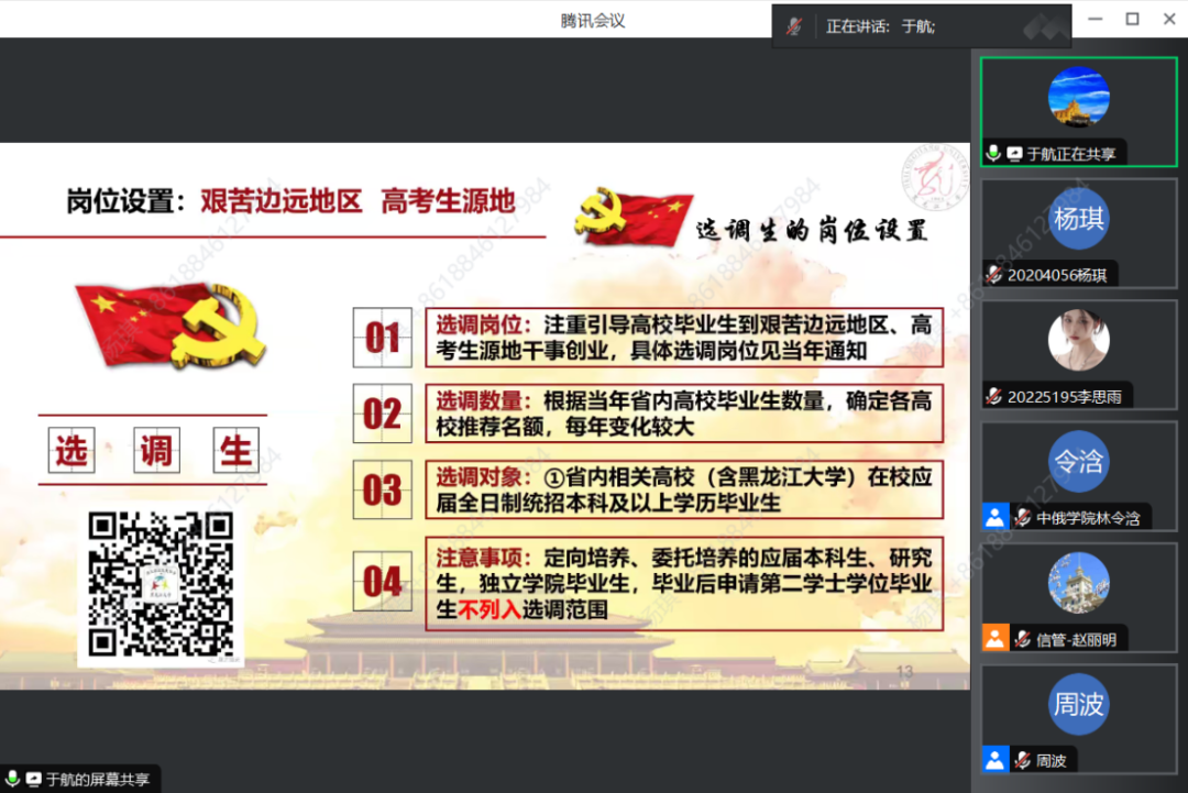 为进一步开展2024届毕业生就业工作,加强毕业生对选调生的认知,明确相关政策和具体要求,全力促进毕业生高效充分就业。B体育联合中俄学院,于2024年2月3日16:00在腾讯会议开展2024年选调生政策解读讲座。本次讲座由黑龙江大学招生就业指导中心就业指导部主任于航老师主讲,B体育党委副书记赵丽明老师主持,中俄学院党总支副书记周波老师、B体育与中俄学院全体辅导员老师、2024届本硕毕业生和部分低年级学生共同参会。