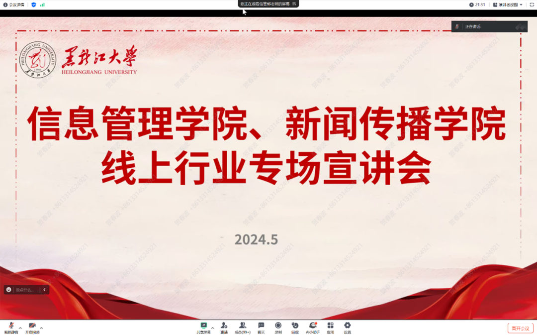 会议伊始,2024届毕业生辅导员郭曦萌为同学们介绍到场的各个企业,它们分别是北京自如住房租赁有限公司、用友新道 数智化人才服务基地(众智科技)、中海物业管理有限公司哈尔滨分公司、九九产业城浙江米思文化艺术有限公司、上海胜营科技(集团)有限公司、新东方国际教育培训、哈尔滨云脉互联科技有限公司、沈阳沐雨乘风网络科技有限责任公司、蒲岐实业、哈尔滨三六五网络科技有限公司等企业。