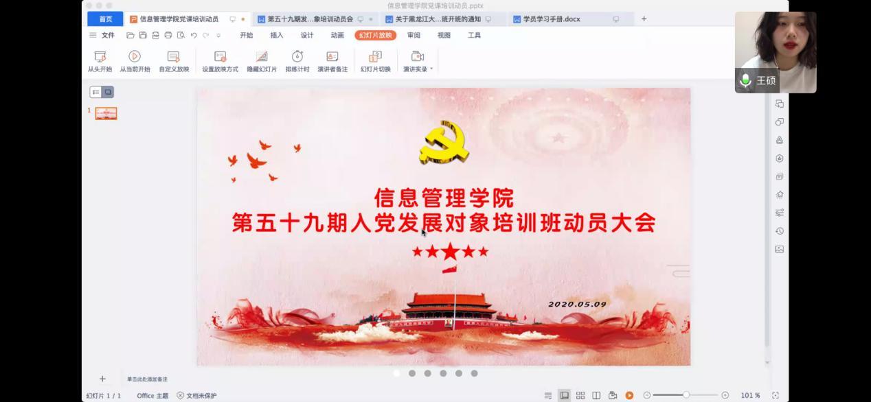 为深入学习贯彻习近平新时代中国特色社会主义思想,大力推进党员队伍建设的系统化、规范化和科学化,切实提高党员发展质量,B体育于2020年5月9日12:10通过线上平台开展“第五十九期入党发展对象培训班动员大会”。本次会议由学院团委副书记、2018级辅导员王硕老师主持,党务秘书李俊春老师出席本次培训,第五十九期入党发展对象培训班学员参加培训。