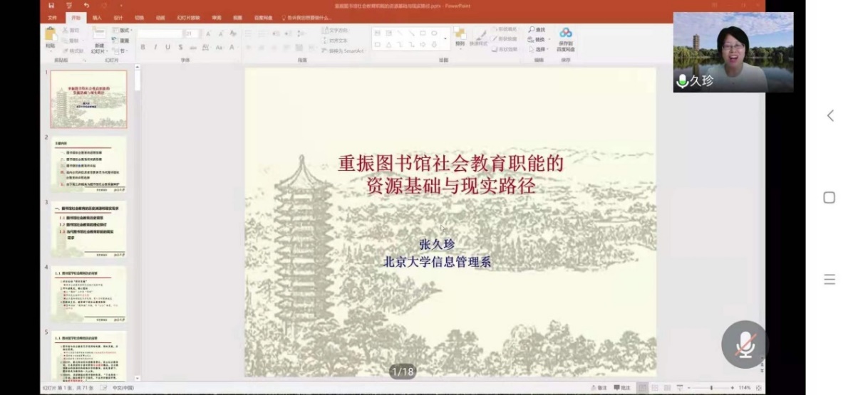 张久珍教授此次报告的题目为“重振图书馆社会教育职能的资源基础与实现路径”。报告共分为五个部分,首先张教授指出图书馆社会教育的思想资源与社会资源,从目前学界对图书馆功能定位谈起,结合图书馆资源的分类与知识服务的社会共识,并列举了国内比较有影响的图书馆开展社会活动的案例,特别提到了刘国钧先生的社会教育思想,指出图书馆社会教育的理论与事实基础;其次她结合《“十四五”公共文化服务体系建设规划》分析了图书馆社会教育的目标,并通过大量的案例论证了面向全民的信息素养教育是当代图书馆社会教育的必然选择;最后报告提出图书馆社会教育的开展要以读者、用户和草根为视角,自下而上的为图书馆的社会教育定目标、定选题、定形式,力争让图书馆为公众提供更具个性化的社会服务。