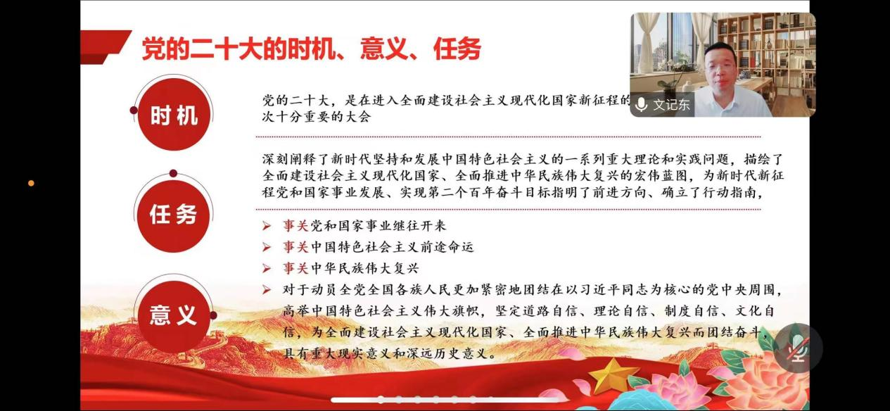 文记东详细介绍了党的二十大主题、主要成果和主要精神,引领师生深刻认识新时代十年的伟大变革及其里程碑意义,更加紧密地团结在以习近平同志为核心的党中央周围,高举中国特色社会主义伟大旗帜;紧接着从“什么是全过程人民民主”“全过程人民民主好在哪里”两个方面介绍了如何学深悟透全过程人民民主,带领师生深刻理解全过程人民民主丰富内涵和重大意义;第三部分文老师介绍了如何发展全过程人民民主,保障人民当家作主,全过程人民民主深深植根于中国大地,是我们党在新时代不断推进中国特色社会主义民主政治理论创新、制度创新、实践创新的经验结晶。最后,任越教授对本次宣讲会进行总结。