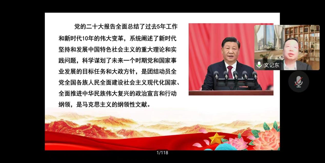 5月18日晚上,马克思主义学院副教授文记东以“发展全过程人民民主,保障人民当家作主”为题开展集中授课第一讲。培训中,文教授主要围绕“党的二十大的主题、主要成果、主要精神”、“学深悟透全过程人民民主”以及“发展全过程人民民主,保障人民当家作主”三大部分生动讲述,帮助参培人员对党的基本理论与基本知识进行更为系统性、全面性和深入性的了解,进一步提高入党积极分子思想政治认识,坚定建设中国特色社会主义理想信念。