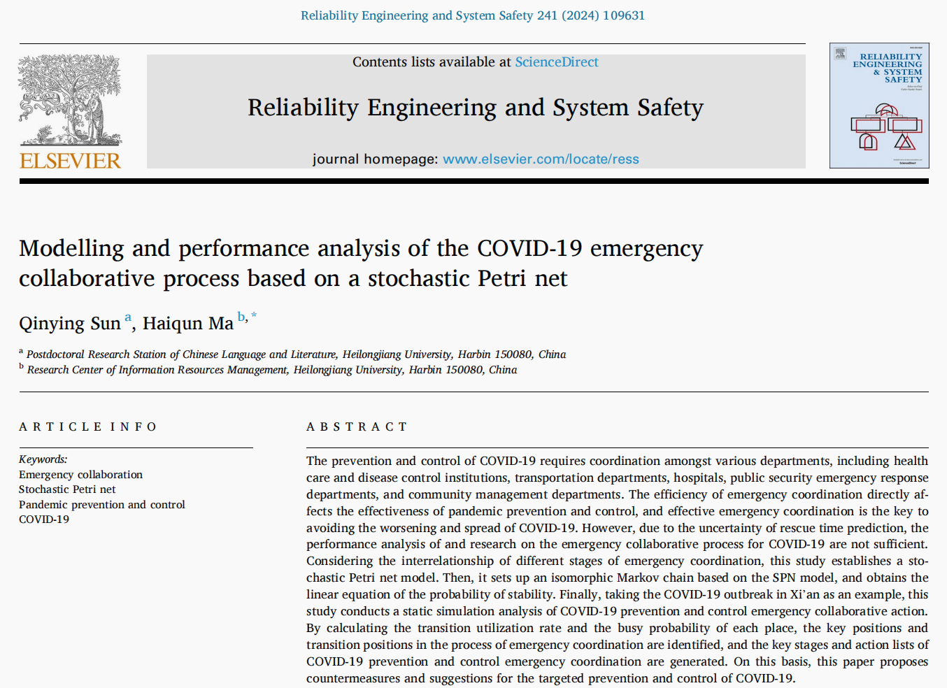 近日,B体育青年教师孙钦莹作为第一作者的研究成果《Modelling and performance analysis of the COVID-19 emergency collaborative process based on a stochastic Petri net》在管理科学领域TOP期刊Reliability Engineering and System Safety在线发表,该期刊是中国科学院SCI管理科学类一区Top期刊,JCR一区,影响因子8.1,该成果受国家社会科学基金资助。该成果是B体育高水平国际合作和高质量人才培养的重要体现和关键标志,显著提升了B体育管理科学与工程学科及信息资源管理学科的科研实力和国际影响力。