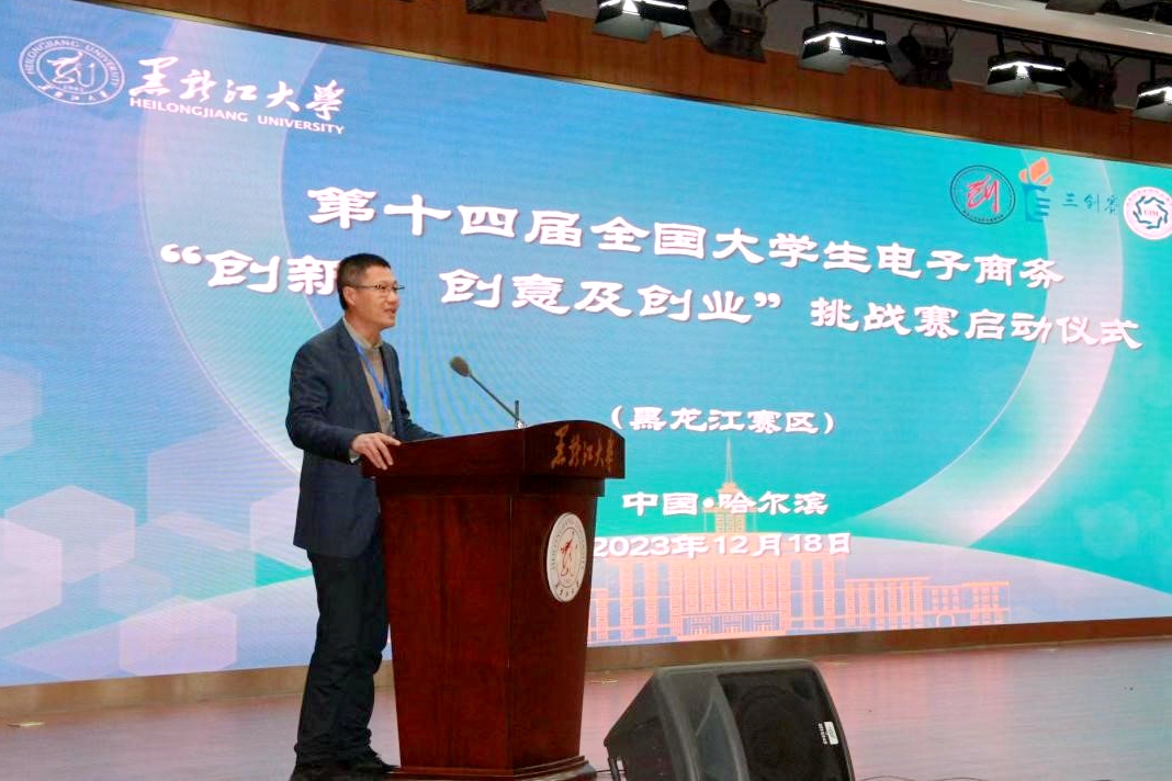 12月18日上午,第十四届全国大学生电子商务“创新、创意及创业”挑战赛黑龙江赛区启动会暨教育部电子商务虚拟教研室基地授牌仪式及校赛负责人和骨干教师培训会在黑龙江大学主楼一楼报告厅举行。副校长井立强教授,教育部电子商务类专业教学指导委员会副主任委员、三创赛组委会主席、教育部电子商务专业虚拟教研室建设负责人、西安交通大学李琪教授,教育部电子商务类专业教学指导委员会副主任委员、三创赛组委会副主席、厦门大学彭丽芳教授,三创赛组委会副秘书长、浙江师范大学电子商务研究与发展中心邹益民主任,三创赛组委会副秘书长、武汉惠赠你网络科技有限公司董事长游文超先生,三创赛黑龙江省赛区赞助商、省大学生创业融资担保有限公司副总经理席艺铭女士,我校教务处、B体育、创新创业教育学院相关负责同志,黑龙江省校赛负责人和骨干教师、参赛学生代表参加会议。会议由我校创新创业教育学院院长孙连刚主持。