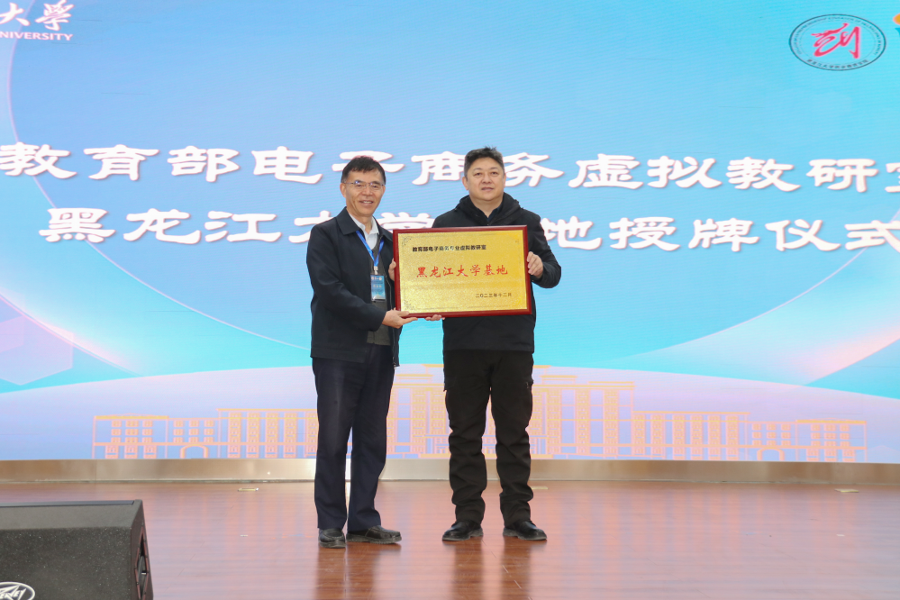 启动仪式后,教育部电子商务专业虚拟教研室负责人李琪教授与教务处林靖副处长共同参加黑龙江大学电子商务虚拟教研室基地授牌仪式,第十八个教育部电子商务虚拟教研室建设基地落户黑龙江大学。