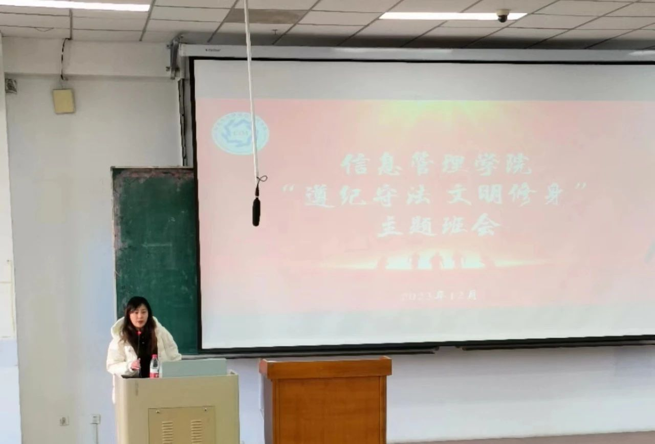 为倡导“遵纪守法,文明修身”的理念,严肃校园纪律,促进校园文明建设,强化同学们的遵纪守法意识和文明素养,B体育于12月11日至12月17日开展“遵纪守法文明修身”主题班会,B体育党委副书记赵丽明同各年级辅导员深入班级,带领同学们一起学习纪律规范,提升文明素养。本次“遵纪守法文明修身”主题班会既是一次深入的思想教育,同时也是对《黑龙江大学学生管理规定》(2023年9月修订)一次深入的学习。信管学子们通过本次主题班会,更加坚持贯彻“遵纪守法,文明修身”的理念,以高尚的品格斩除万难,以良好的素质奋进新的未来。