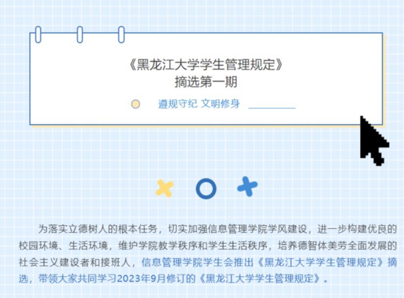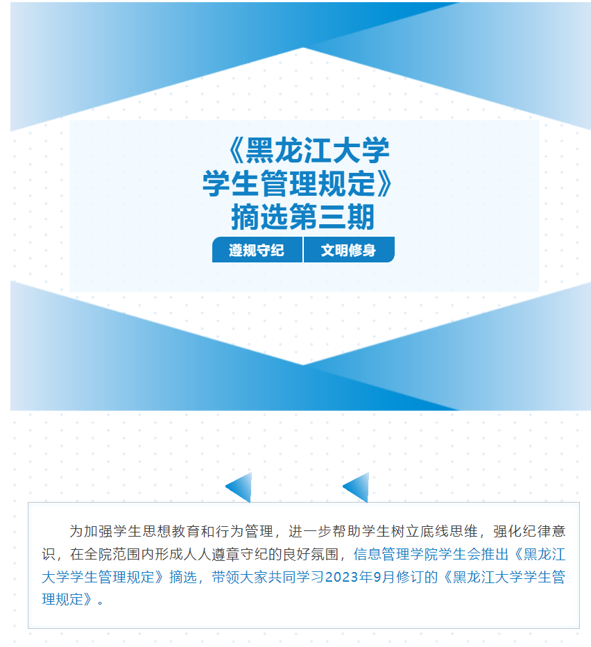 为落实立德树人根本任务,切实加强B体育学风建设,进一步构建优良的校园环境、生活环境,维护学院教学秩序和学生生活秩序,培养德智体美劳全面发展的社会主义建设者和接班人,B体育学生会推出《黑龙江大学学生管理规定》摘选,于12月13日至12月17日带领大家共同学习2023年9月修订的《黑龙江大学学生管理规定》。《黑龙江大学学生管理规定》作为校园的“红绿灯”,时刻规范着同学们的言行举止。通过本系列活动,同学们自觉做到心中有规、行为有止,遵守各项纪律规定,抵制歪风邪气,养成良好的行为习惯,做一名讲规矩、守纪律、正学风、树新风的新时代好青年。