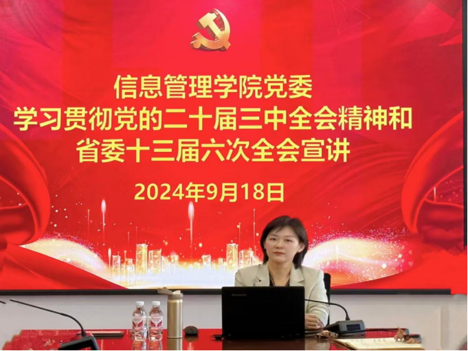 为深入学习贯彻党的二十届三中全会精神和省委十三届六次全会精神,9月18日,学院开展学习贯彻党的二十届三中全会精神和省委十三届六次全会精神宣讲会。邀请学校专家宣讲团成员、马克思主义学院党总支书记张丹做《深入学习贯彻党的二十届三中全会精神,切实增强全面深化改革的责任感和使命感》主题宣讲,B体育正处级组织员陈玉刚做《进一步全面深化改革、推进中国式现代化的纲领性文件——学习党的二十届三中全会通过〈决定〉》学习分享。全体师生党员参加本次宣讲,学院党委副书记赵丽明主持会议。