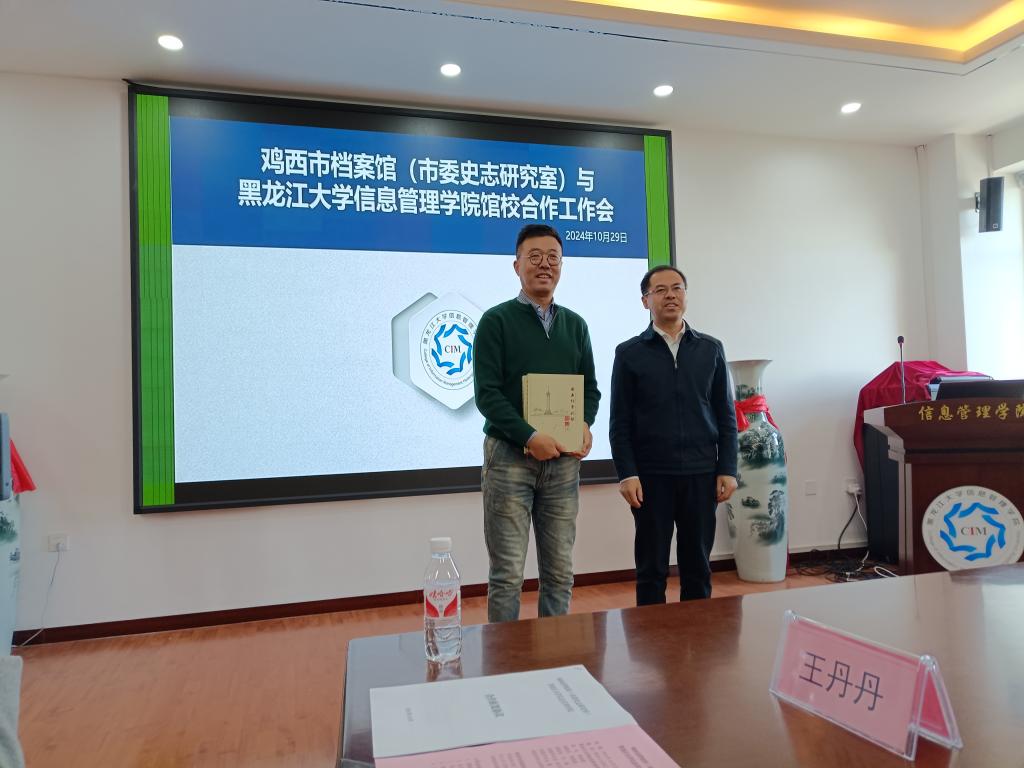 徐财福代表鸡西市档案馆向学院赠送了一部珍贵的馆藏档案汇编成果——《鸡西记忆:城市档案精选》。这部汇编不仅是对鸡西悠久历史文化的生动展现,也是双方合作友谊的见证。