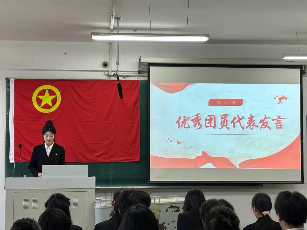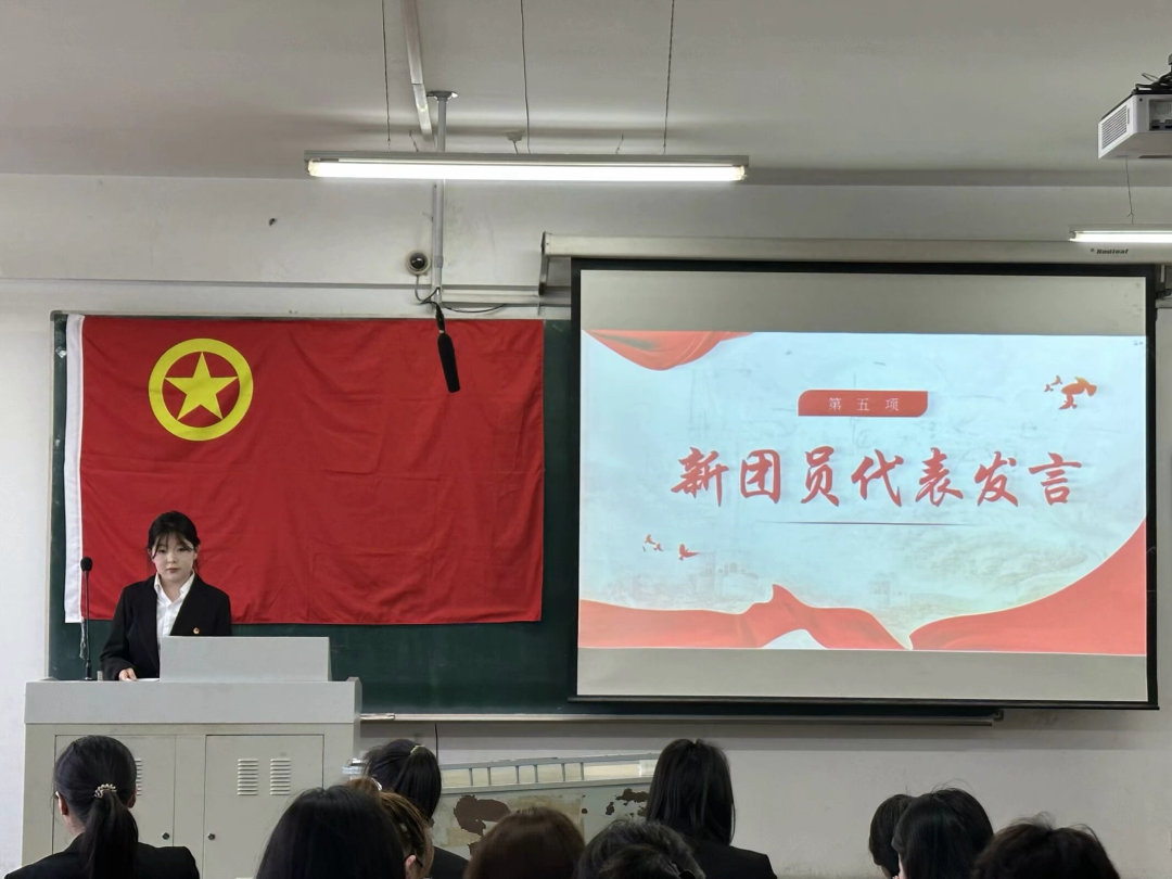 仪式第六项,优秀团员代表2023级电子商务专业季鑫同学发言。她向新团员们发出号召,希望新团员明确自身肩负的责任与使命,不断进步、茁壮成长,用实际行动诠释“党有号召、团有行动”的忠诚底色。