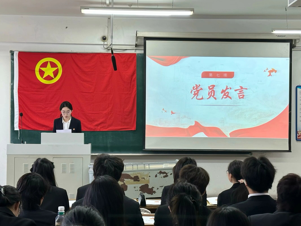 仪式第七项,党员代表2023级图书馆学专业王天盈同学发言。她首先向新团员们表示热烈祝贺,鼓励新团员要深植理想信念的种子,提高思想站位,把牢听党话、跟党走的青春航向,以磅礴动能和创新活力,为学院团组织贡献青春力量。