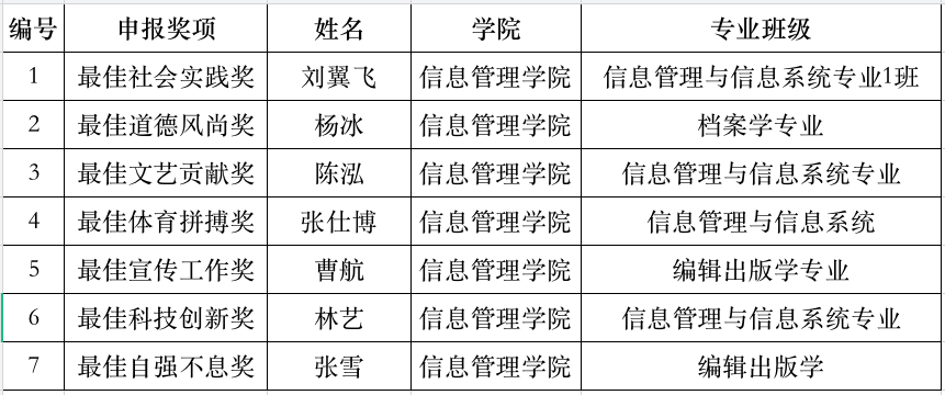 根据校团委《关于评选黑龙江大学第二十四届“校园最佳”大学生的通知》文件相关要求,B体育严格按照规定的程序,本着公开、公平、公正的原则组织开展评审工作,经学生自愿报名,学院初评,拟向学校推荐以下7名同学参加黑龙江大学第二十四届“校园最佳”大学生评选,特此公示。