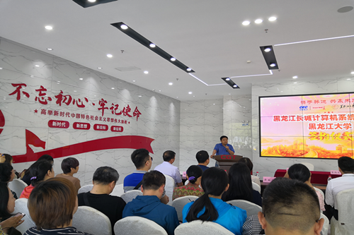马海群书记首先带领学院院教师及学生党员代表40余人参观了黑龙江长城科技展厅及智能制造车间,黑龙江长城计算机系统有限公司郑大庆副总经理向各位师生介绍了黑龙江长城的发展历程、核心主业、战略布局以及未来信创产业的发展前景。