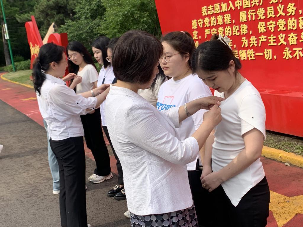 传承誓言,为新党员佩戴党员徽章。庄严宣誓后,学院党委书记刘荫梅,院长黄丽霞和2023级学生党支部书记孙悦为新党员们佩戴党员徽章,并叮嘱他们要时刻牢记共产党员的身份,严格要求自己。新党员纷纷表示:要在青春的赛道上奋力奔跑,以实际行动书写对党和祖国、人民的无限忠诚。